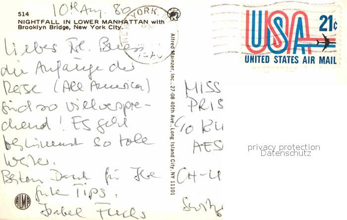 72646531 old postcard Manhattan New York Nightfall in Lower Manhattan Brooklyn Bridge postalisch gelaufen Erhaltung siehe scans [FriedD77] KatCode: 14140340000000