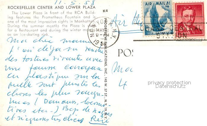 73130842 old postcard Manhattan New York Rockefeller Center and Lower Plaza RCA Building Prometheus Fountain postalisch gelaufen Erhaltung siehe scans [FriedD77] KatCode: 14140340000000