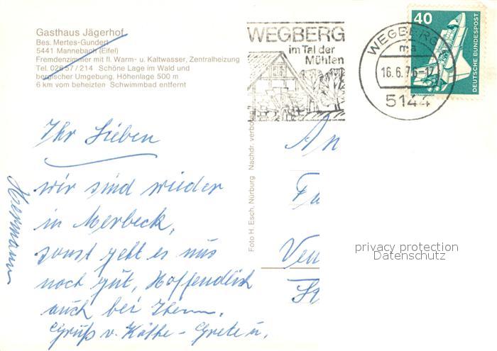 73731199 alte Postkarte Mannebach Eifel Gasthaus Jaegerhof Freibad Kelberg Landschaftspanorama postalisch gelaufen Erhaltung siehe scans [FriedD77] KatCode: 11110007233225