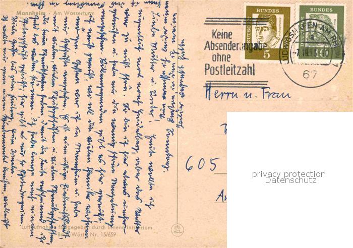 72879515 alte Postkarte MANNHEIM BW Fliegeraufnahme Wasserturm postalisch gelaufen Erhaltung siehe scans [AndreD76] KatCode: 11110008222000