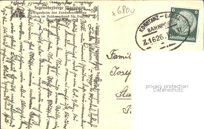 41801219 MANNHEIM BW Jugendherberge Bahnpost postalisch gelaufen Erhaltung siehe scans Alte Ansichtskarte Postkarte alte Postkarte Nata Katcode 11110008222000