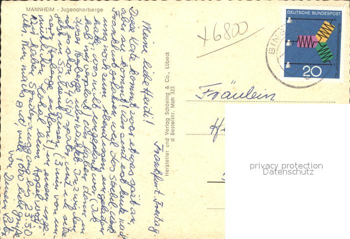 41801292 MANNHEIM BW Jugendherberge postalisch gelaufen Erhaltung siehe scans Alte Ansichtskarte Postkarte alte Postkarte Nata Katcode 11110008222000