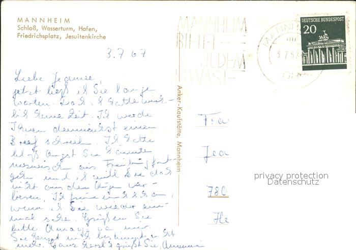 72364877 alte Postkarte MANNHEIM BW Schloss Wasserturm Hafen Friedrichsplatz Jesuitenkirche postalisch gelaufen Erhaltung siehe scans KatCode: 11110008222000