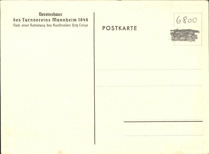 41326546 MANNHEIM BW Vereinshaus des Turnvereins Kuenstlerkarte nach einer Radierung des Kunstmalers Fritz Lange postalisch nicht gelaufen gute Erhaltung Alte Ansichtskarte Postkarte hz_F Katcode 11110008222000