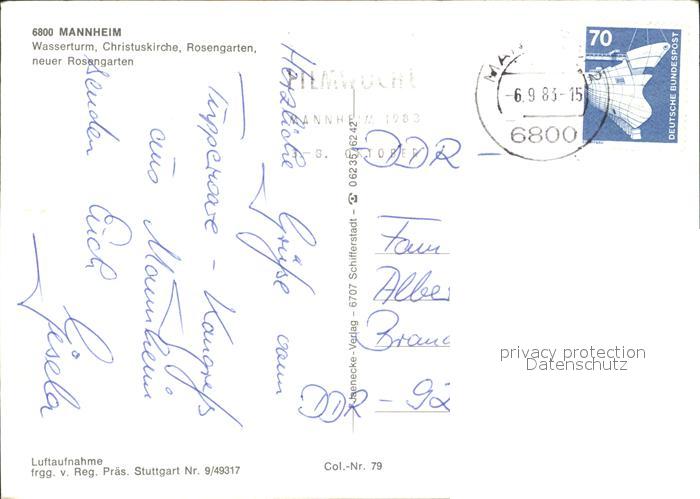 72303589 alte Postkarte MANNHEIM BW Wasserturm Christuskirche Rosengarten Fliegeraufnahme postalisch gelaufen Erhaltung siehe scans KatCode: 11110008222000