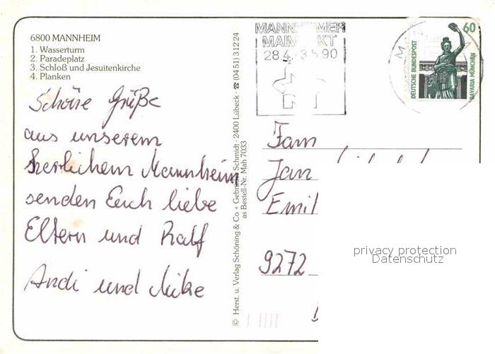 72617391 alte Postkarte MANNHEIM BW Wasserturm Paradeplatz Schloss Jesuitenkirche Planken postalisch gelaufen Erhaltung siehe scans [WerneD78] KatCode: 11110008222000