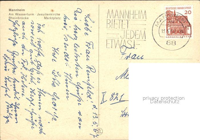 72409746 alte Postkarte MANNHEIM BW Wasserturm Rheinbruecke Marktplatz postalisch gelaufen Erhaltung siehe scans KatCode: 11110008222000
