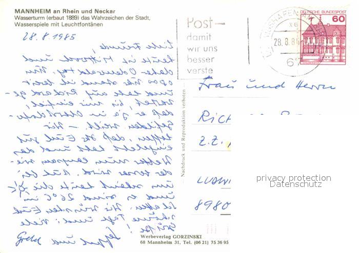 72744015 alte Postkarte MANNHEIM BW Wasserturm Wahrzeichen Wasserspiele mit Leuchtfontaenen postalisch gelaufen Erhaltung siehe scans [FriedD77] KatCode: 11110008222000