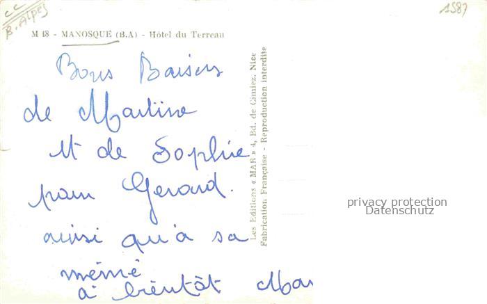14104732 Manosque Forcalquier 04 Alpes-de-Haute-Provence Hôtel du Terreau postalisch nicht gelaufen Erhaltung siehe scans [FriedD77] KatCode: 11170004404112
