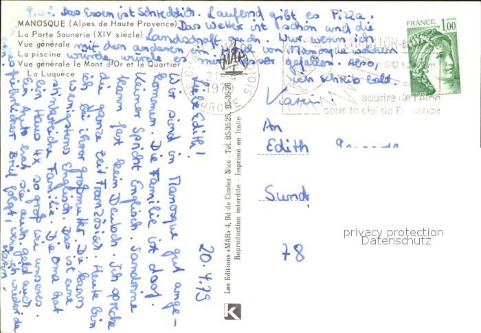 12600544 carte postale Manosque La Porte Saunerie XIV siecle Piscine Mont d Or Quartier La Luquece postalisch gelaufen Erhaltung siehe scans [FriedD77] KatCode: 11170004404112