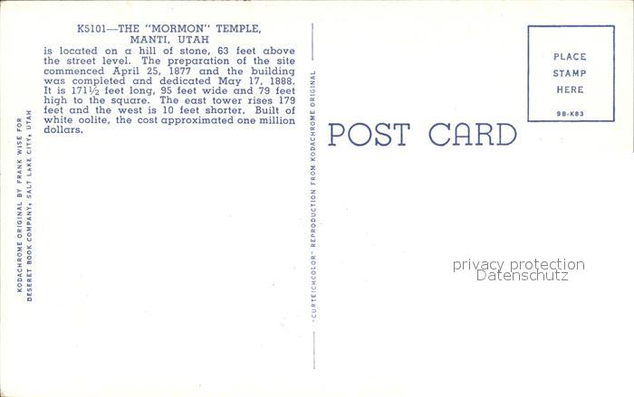 72492531 Manti USA The Mormon Tempel postalisch nicht gelaufen Erhaltung siehe scans KatCode: 14140