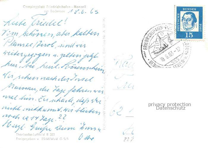 34144486 alte Postkarte Manzell Friedrichshafen Bodenseekreis BW Campingplatz am Bodensee Fliegeraufnahme postalisch gelaufen Erhaltung siehe scans [WerneD78] KatCode: 11110008435016