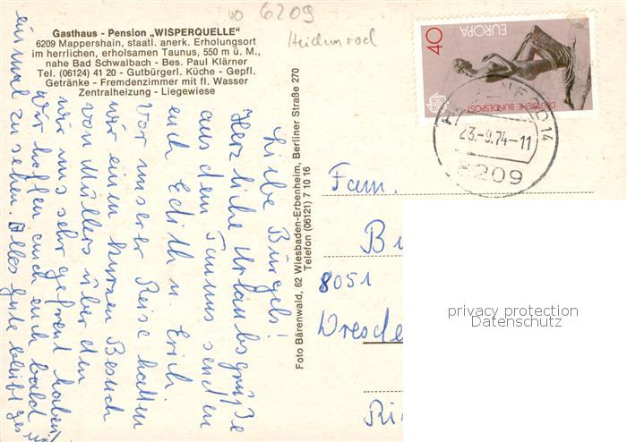 73863420 alte Postkarte Mappershain Gasthaus Pension Wisperquelle Gastraum Landschaft postalisch gelaufen Erhaltung siehe scans [FriedD77] KatCode: 11110006439005