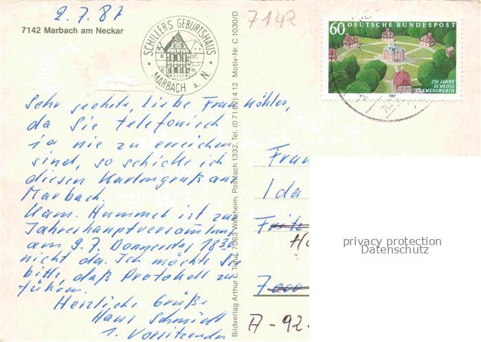 74053119 alte Postkarte Marbach Neckar Friedrich Schiller Portrait Geburtshaus Nationalmuseum Teilansicht Stadthalle Alexanderkirche postalisch gelaufen Erhaltung siehe scans [WerneD78] KatCode: 11110008118049