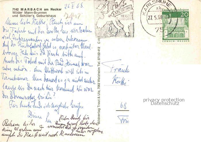74053190 alte Postkarte Marbach Neckar Wilder Mann Brunnen mit Schiller Geburtshaus postalisch gelaufen Erhaltung siehe scans [WerneD78] KatCode: 11110008118049