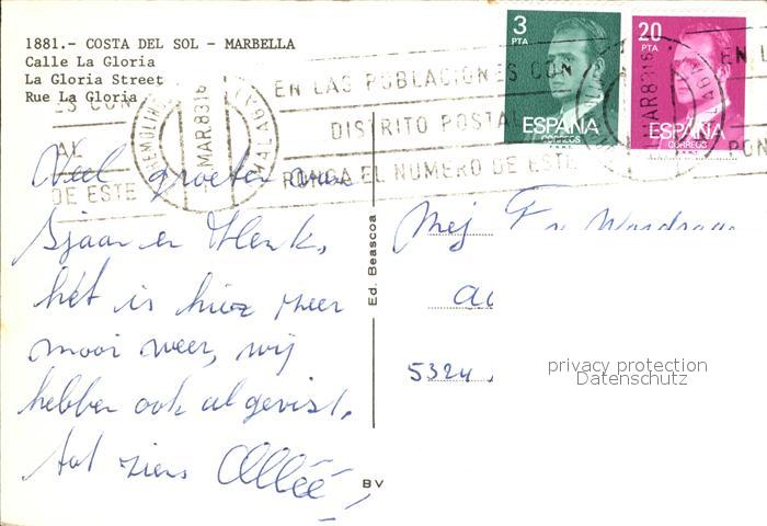 old postcard Marbella Andalucia Calle La Gloria postalisch gelaufen Erhaltung siehe scans