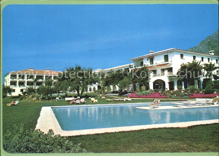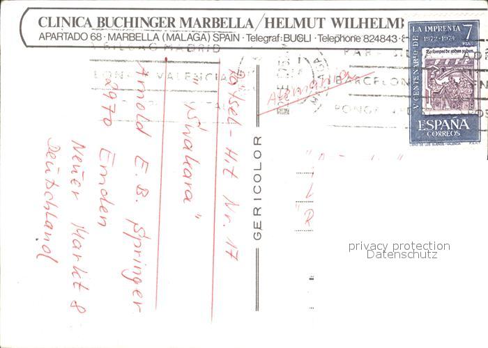 old postcard Marbella Andalucia Clinica Buchinger Swimming Pool postalisch gelaufen Erhaltung siehe scans