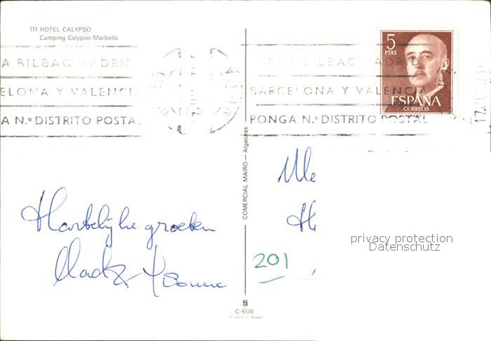 old postcard Marbella Andalucia Hotel Calypso postalisch gelaufen Erhaltung siehe scans