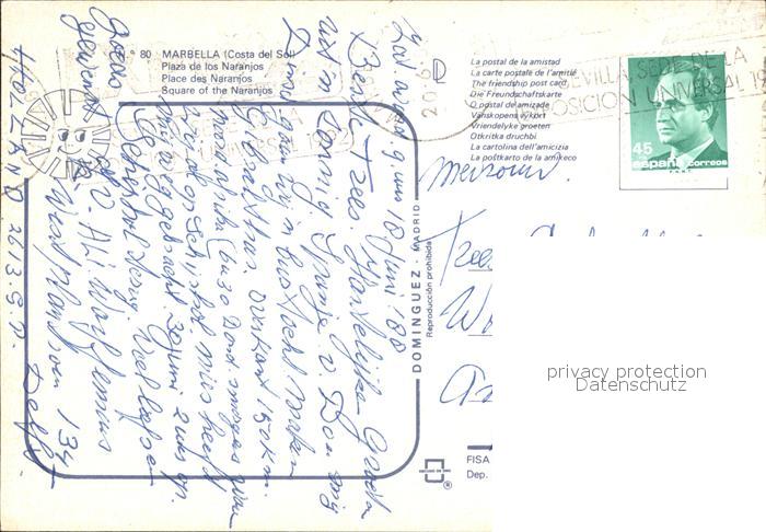 old postcard Marbella Andalucia Piaza de los Narajos postalisch gelaufen Erhaltung siehe scans