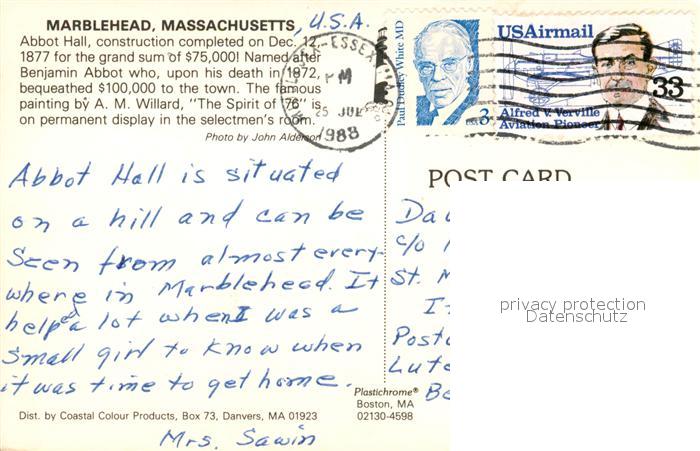 73059078 old postcard Marblehead Abbot Hall postalisch gelaufen Erhaltung siehe scans [WerneD78] KatCode: 14140230000000