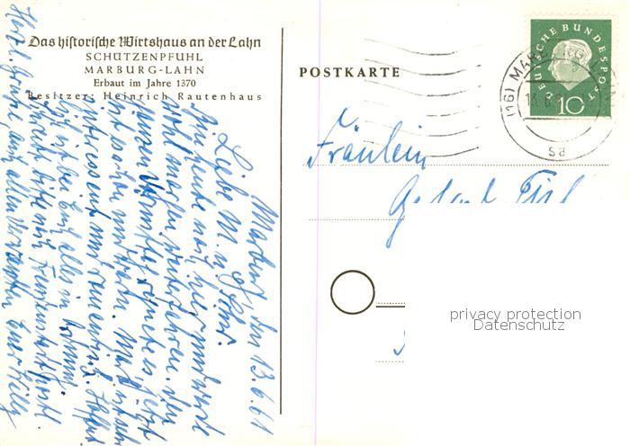 73853979 alte Postkarte Marburg Lahn Das historische Wirtshaus an der Lahn Schuetzenpfuhl Zeichnung postalisch gelaufen Erhaltung siehe scans [WerneD78] KatCode: 11110006534014