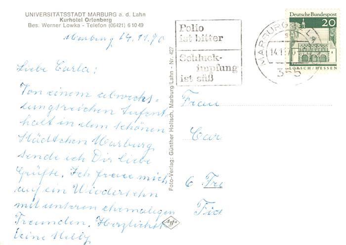 73876240 alte Postkarte Marburg Lahn Kurhotel Ortenberg postalisch gelaufen Erhaltung siehe scans [WerneD78] KatCode: 11110006534014