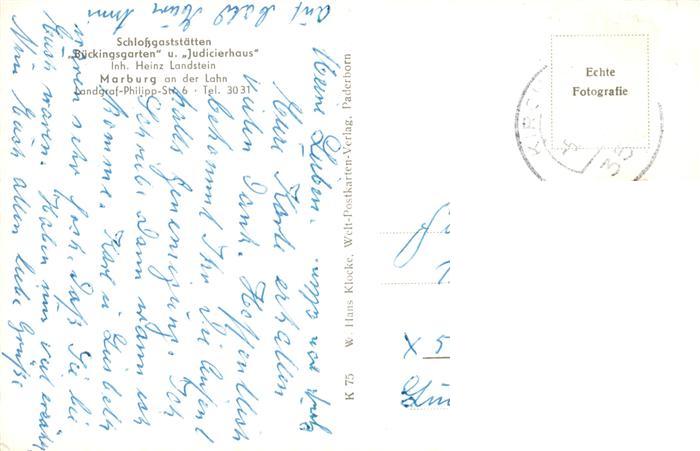 73945570 alte Postkarte Marburg Lahn Schlossgaststaetten Bueckingsgarten und Judicierhaus postalisch gelaufen Erhaltung siehe scans [FriedD77] KatCode: 11110006534014
