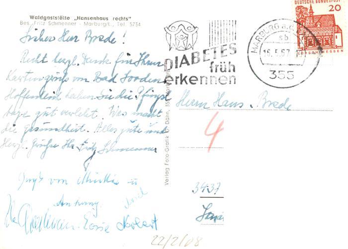 73864402 alte Postkarte Marburg Lahn Waldgaststaette Hansenhaus rechts Gartenrestaurant postalisch gelaufen Erhaltung siehe scans [FriedD77] KatCode: 11110006534014