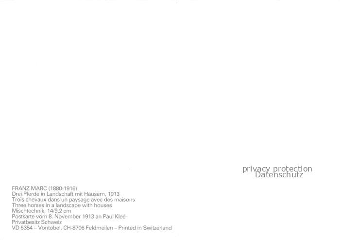 MARC Franz (1880-1916) Kuenstlerkarte drei Pferde in Landschaft mit Haeuser