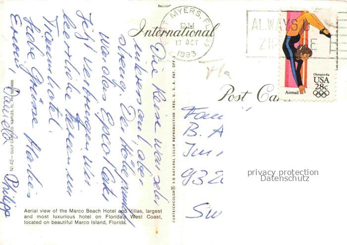 74119664 old postcard Marco Island Florida USA The Marco Beach Hotel and villas aerial view postalisch gelaufen Fliegeraufnahme Erhaltung siehe scans [FriedD77] KatCode: 14140110000000
