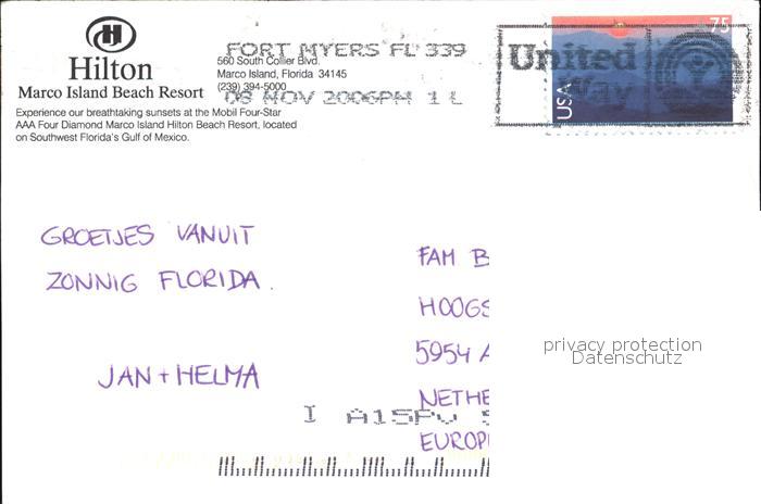 72443828 old postcard Marco Island Hotel Hilton Pool postalisch gelaufen Erhaltung siehe scans KatCode: 14140110000000