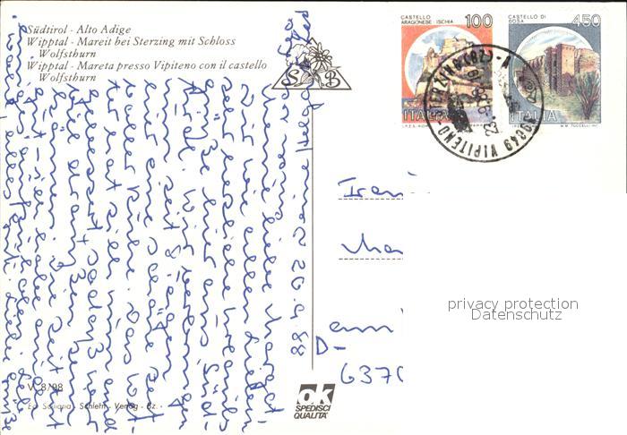 old postcard Mareit Sterzing Suedtirol Wipptal Kirche mit Schloss Wolfsthurm postalisch gelaufen Erhaltung siehe scans