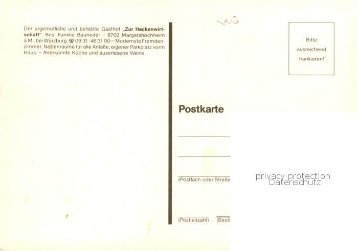 73873654 Margetshoechheim Cafe Pension zur Heckenwirtschaft Gastraeume Zimmer postalisch nicht gelaufen Erhaltung siehe scans [WerneD78] KatCode: 11110009679161