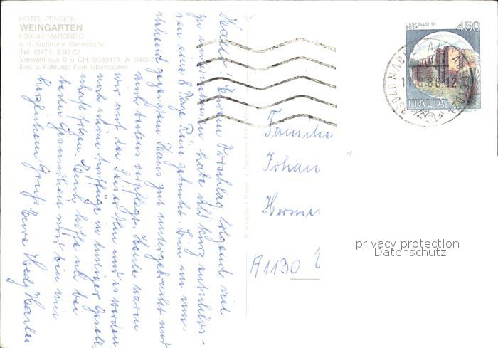 old postcard Margreid Weinstrasse Hotel Pension Weingarten postalisch gelaufen Erhaltung siehe scans