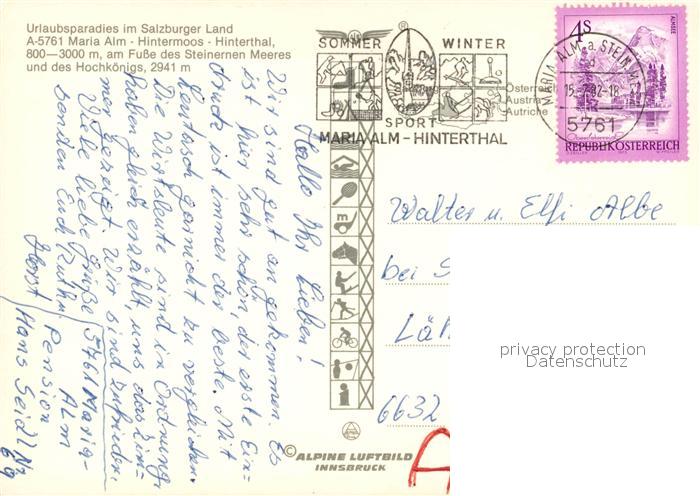 73598702 alte Postkarte Maria Alm Steinernen Meer Bundessportschule Hintermoos Hinterthal postalisch gelaufen Erhaltung siehe scans [PaolaD17] KatCode: 11390322050612