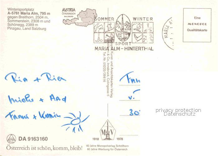 72892960 alte Postkarte Maria Alm Steinernen Meer mit Breithorn Sommerstein Schoenegg postalisch gelaufen Erhaltung siehe scans [WerneD78] KatCode: 11390322050612
