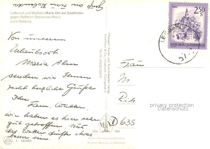 73157724 alte Postkarte Maria Alm Steinernen Meer mit Selbhorn postalisch gelaufen Erhaltung siehe scans [WerneD78] KatCode: 11390322050612