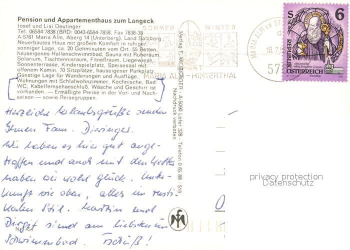 73312296 alte Postkarte Maria Alm Steinernen Meer Pension Appartementhaus zum Langeck Hallenbad Alpenblick postalisch gelaufen Erhaltung siehe scans [FriedD77] KatCode: 11390322050612
