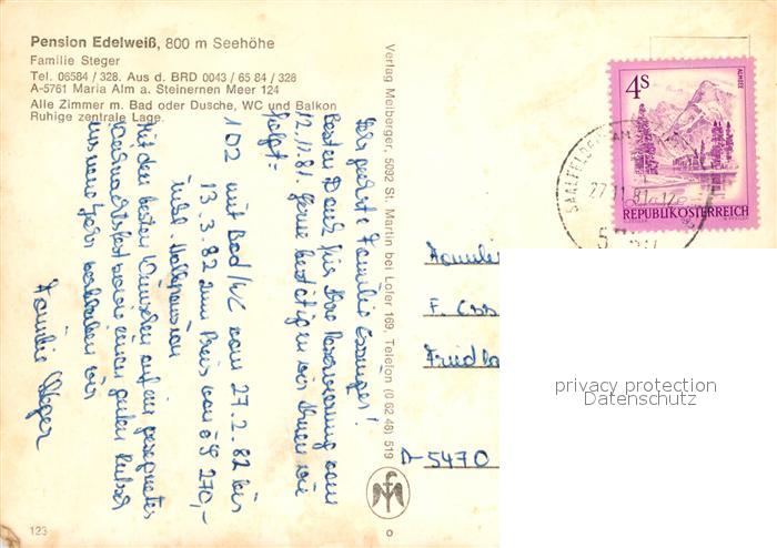 12934821 alte Postkarte Maria Alm Steinernen Meer Pension Edelweiss postalisch gelaufen Erhaltung siehe scans [NatalD47] KatCode: 11390322050612