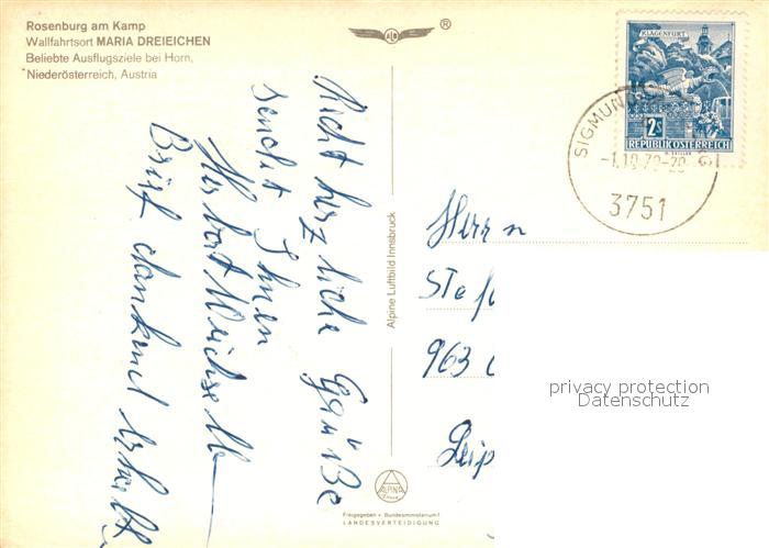 73049130 alte Postkarte Maria Dreieichen Fliegeraufnahme Rosenburg am Kamp postalisch gelaufen Erhaltung siehe scans [KathaD81] KatCode: 11390124031121