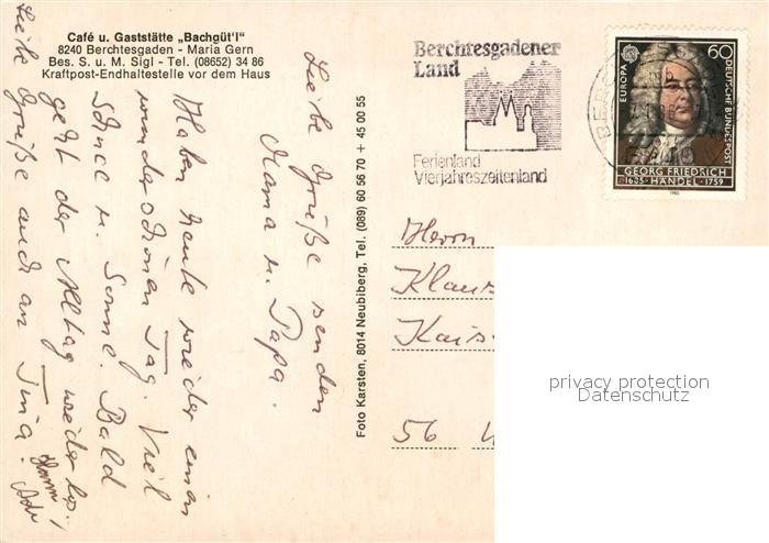73324298 alte Postkarte Maria Gern Cafe Gaststaette Bachguet’l Kirche Landschaftspanorama Alpen postalisch gelaufen Erhaltung siehe scans [FriedD77] KatCode: 11110009172116