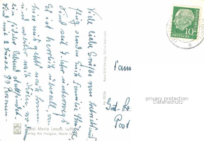 72816532 alte Postkarte Maria Laach Glees Abtei Kloster am Laacher See Fliegeraufnahme postalisch gelaufen Erhaltung siehe scans [FriedD77] KatCode: 11110007131205