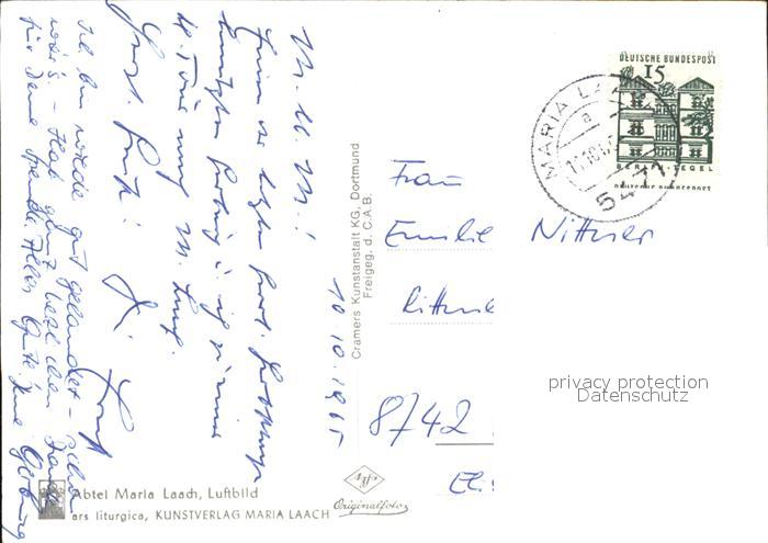 72513864 alte Postkarte Maria Laach Glees Abtei Maria Laach Fliegeraufnahme postalisch gelaufen Erhaltung siehe scans KatCode: 11110007131205
