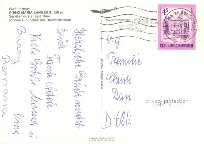 73340813 alte Postkarte Maria Langegg Kloster Panorama Wallfahrtsort Fliegeraufnahme postalisch gelaufen Erhaltung siehe scans [FriedD77] KatCode: 11390124031327