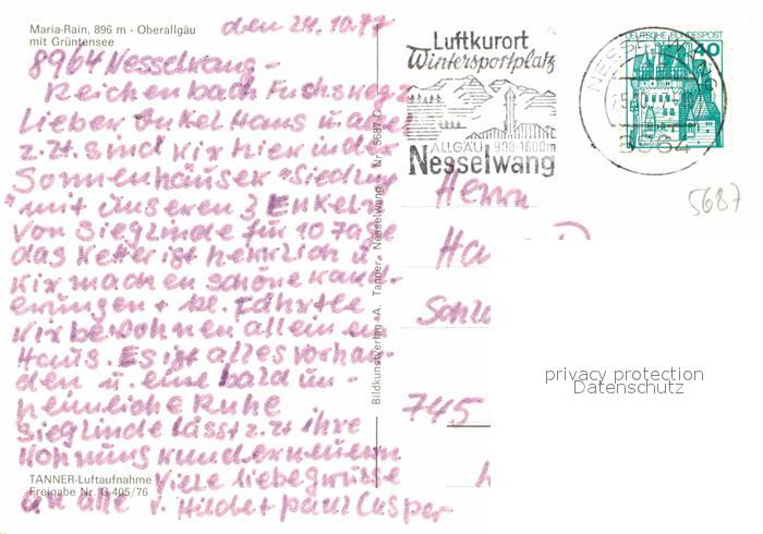 72835156 alte Postkarte Maria Rain Allgaeu Gruentensee Stuiben Fliegeraufnahme postalisch gelaufen Erhaltung siehe scans [NatalD47] KatCode: 11110009780128