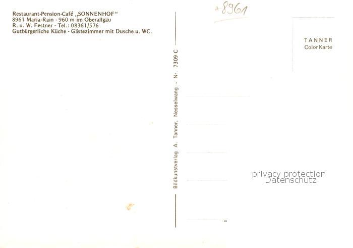 73868212 Maria Rain Allgaeu Pension Cafe Sonnenhof Restaurant postalisch nicht gelaufen Erhaltung siehe scans [FriedD77] KatCode: 11110009780128
