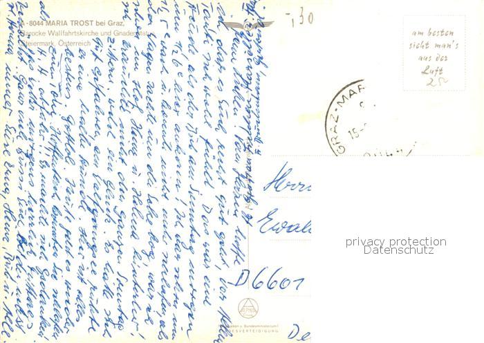 73340265 alte Postkarte Maria Trost Barocke Wallfahrtskirche Fliegeraufnahme Wappen postalisch gelaufen Erhaltung siehe scans [FriedD77] KatCode: 11390221060101