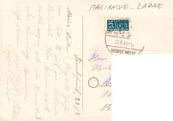 old postcard Marianske Lazne Marienbad CZ Schillerplatz Maehr. Schoenberg Rathaus Eger Stadttheater postalisch gelaufen Erhaltung siehe scans [FriedD77]