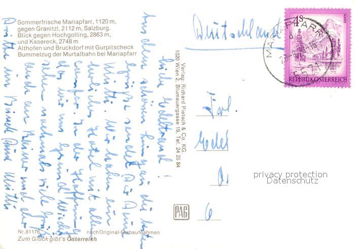 72948161 alte Postkarte Mariapfarr Bummelzug Murtalbahn Granitzl Salzburg Hochgolling Kasereck postalisch gelaufen Erhaltung siehe scans [KathaD81] KatCode: 11390321050503