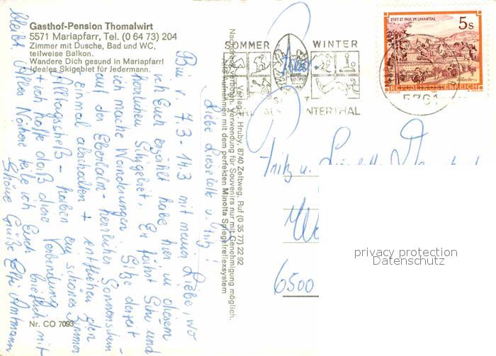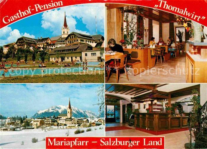 72835117 alte Postkarte Mariapfarr Gasthof Pension Thomalwirt Ortsansicht mit Kirche Winterpanorama Freibad postalisch gelaufen Erhaltung siehe scans [FriedD77] KatCode: 11390321050503